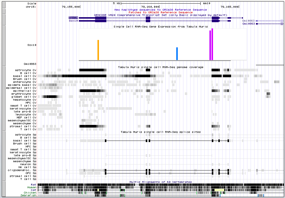 Below is a screenshot of a public session that highlights the Tabula Muris gene expression track. The session shows the Sox10 locus. The gene expression track at the top shows that the gene is only well expressed in basal cells (orange), mammary gland (blue) and oligodendrocytes (pink). These cell type names are shown when you hover with the mouse over the bars on the genome browser. The coverage tracks below show that all exons are transcribed in these, but the last exon is also transcribed in stromal cells and some non-coding transcription is seen in goblet cells 3' of the gene. The splicing tracks below show that proper splicing is limited to the four cell types described above. This is also a non-coding region conserved in zebrafish and chicken.